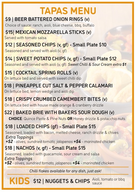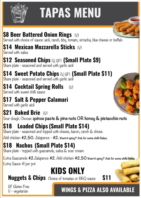 Our tapas selection includes salt and pepper calamari, vegetarian spring rolls, nachos, loaded chips and more. Some items can be tailored to your requirements with different toppings and sauces. Come and speak to us about what you love and lets make it happen!